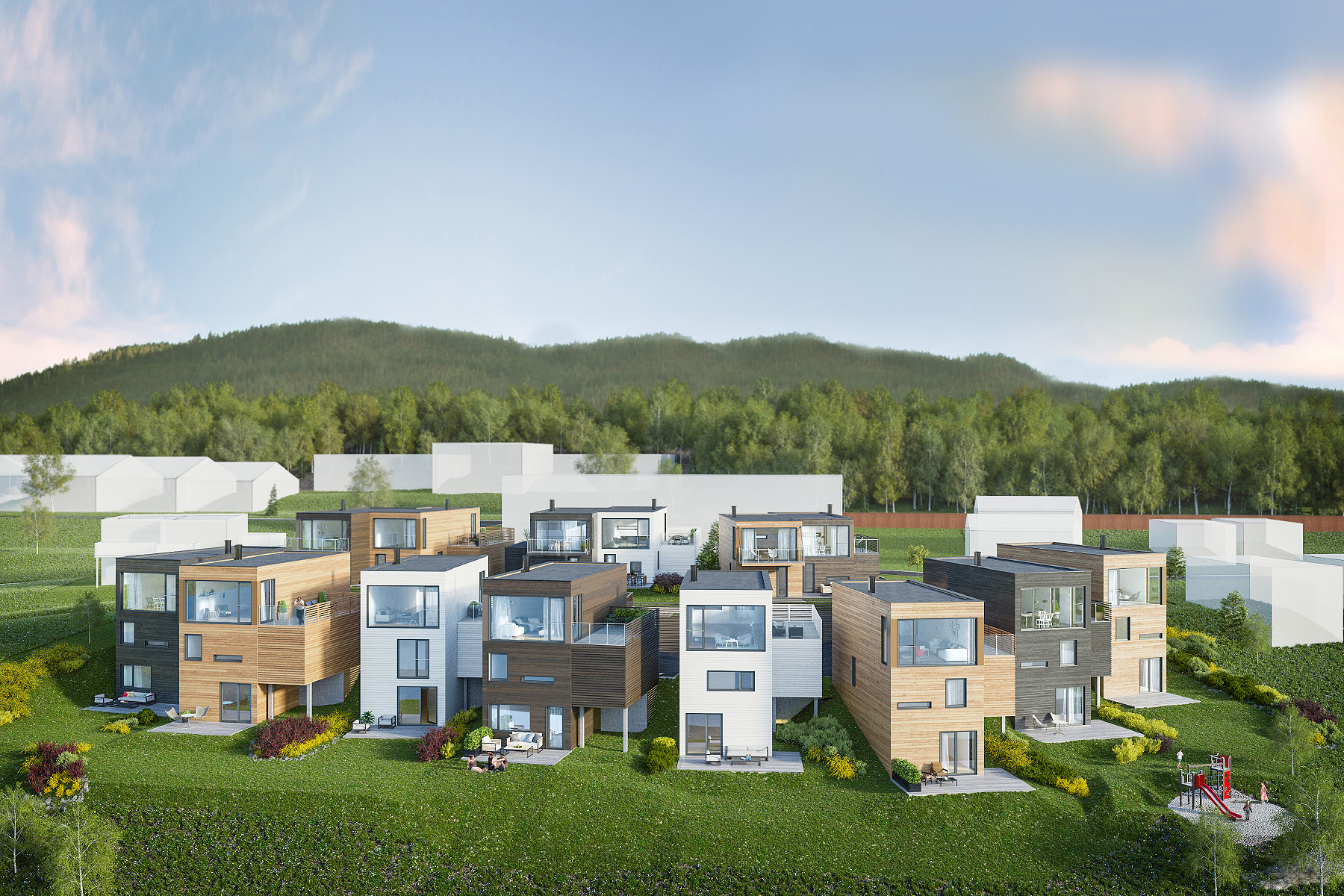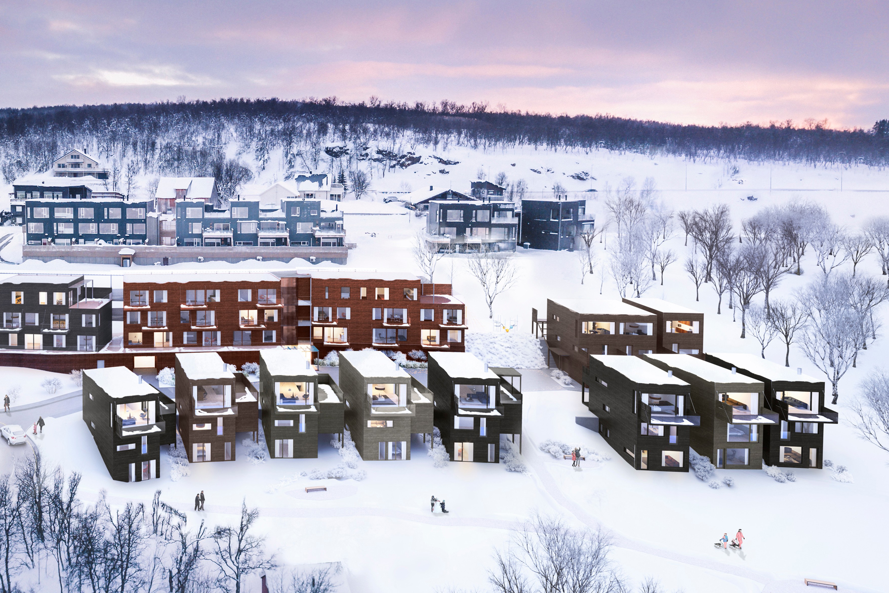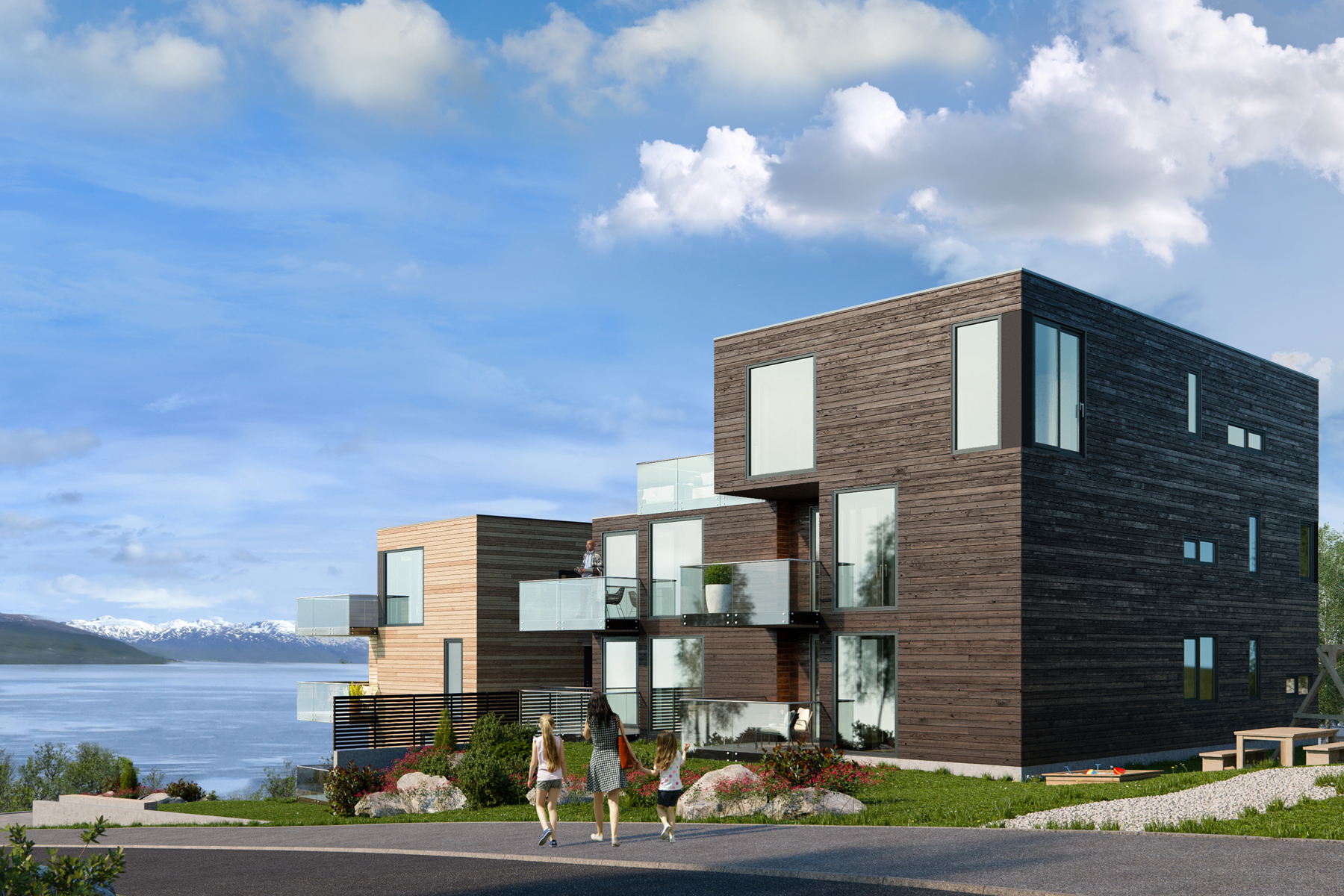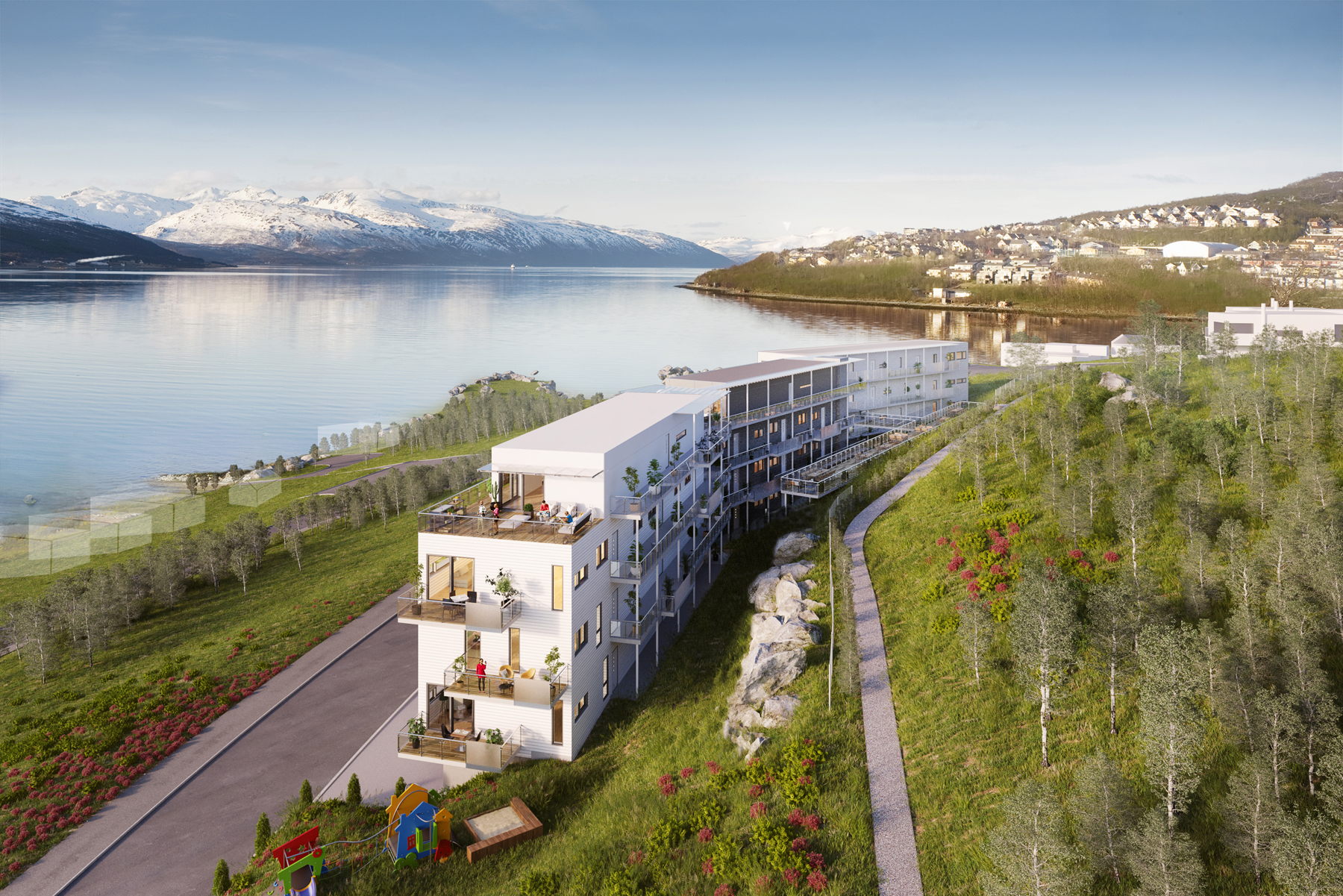 Moderne arkitekttegnede eneboliger og vertikaldelte boliger. Boligene har store utsiktsvinduer med nydelig utsikt mot Kvaløya og Ringvassøya.